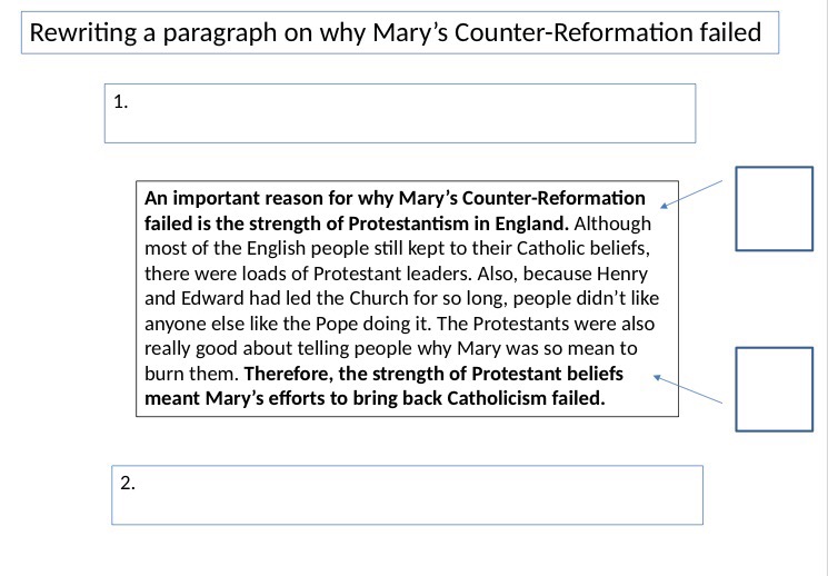 The first time I tried this was with a Year 8 class, who were tasked with writing an essay on Mary I. First, we revisited the narrative. At certain points we stopped and I showed them 3 statements from what we had learnt. Their task was to select the most RELEVANT fact to answer the enquiry (and essay) question: