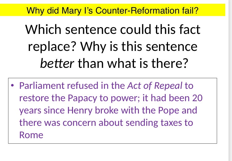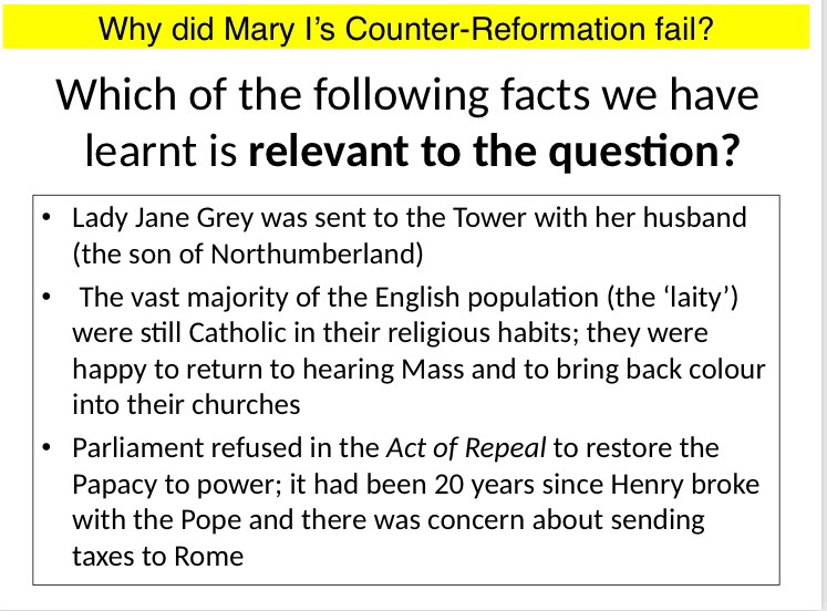 The first time I tried this was with a Year 8 class, who were tasked with writing an essay on Mary I. First, we revisited the narrative. At certain points we stopped and I showed them 3 statements from what we had learnt. Their task was to select the most RELEVANT fact to answer the enquiry (and essay) question: