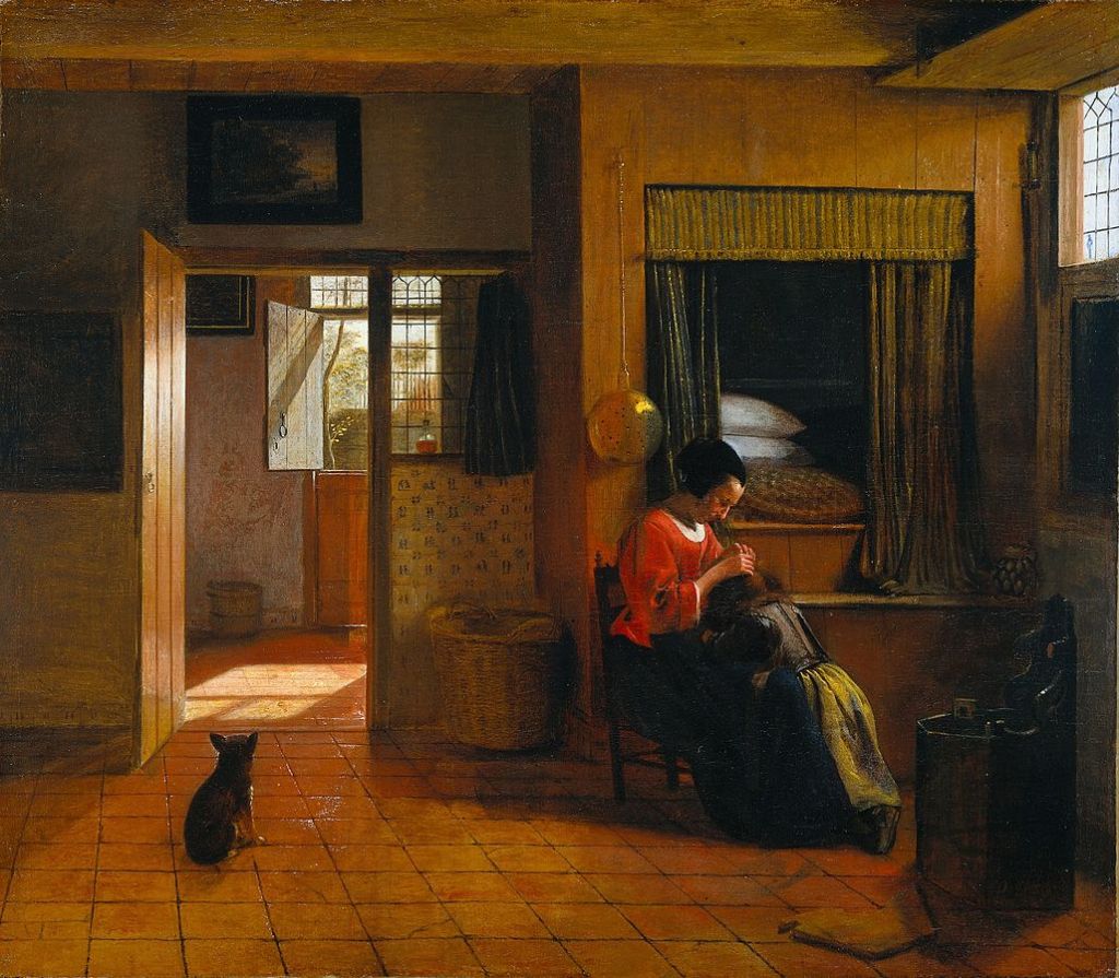 This painting, by de Hooch, shows nothing more impressive than a mother patiently removing nits from her child’s hair. There is a kindly afternoon light showing through a window, and a small pet that might be comforting to stroke.