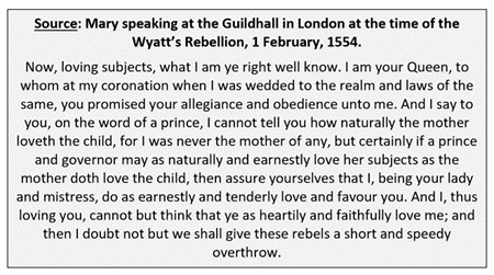 There’s so much to say about this source. This is a very clever Queen, reminding her subjects of her legitimacy, her strength, her maternal love for her people, and using a declarative ‘we shall’ to urge her subjects to stand against Wyatt.